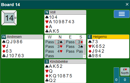 Noen vil kanskje si at syd skulle meldt mer, han har jo 14 poeng, men det er jeg uenig i. Dette er 14 dårlige, helt flatt, og det er veldig sjelden utgang med dette mot den hånden nord annonserer.