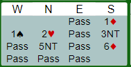 Hvis en bruker det slik er 3 hjerter et alternativ, men jeg synes absolutt 2 hjerter er greit med disse kortene, altså. Det ser ikke ut som om AQJ i spar har full verdi med åpneren bak deg, og det finnes skarpere 10-poengere med femkorts farge som kanskje er mer aktuelle for den nevnte meldingen, om avtalen da er slik at dobbelthoppet viser den type hånd.