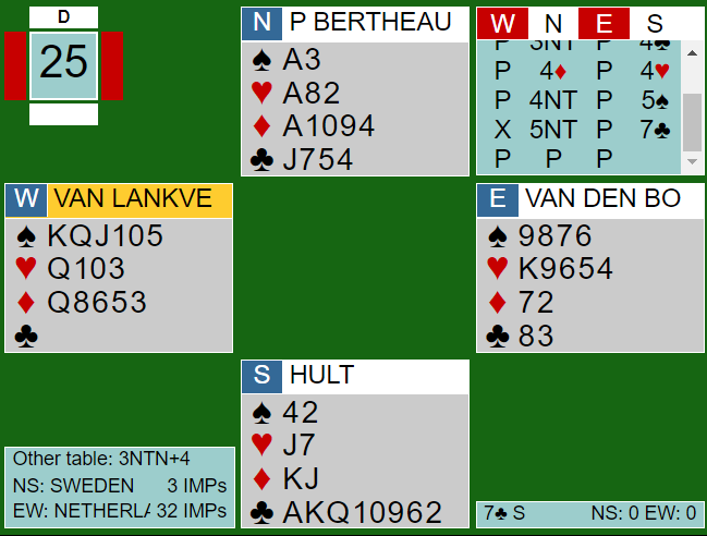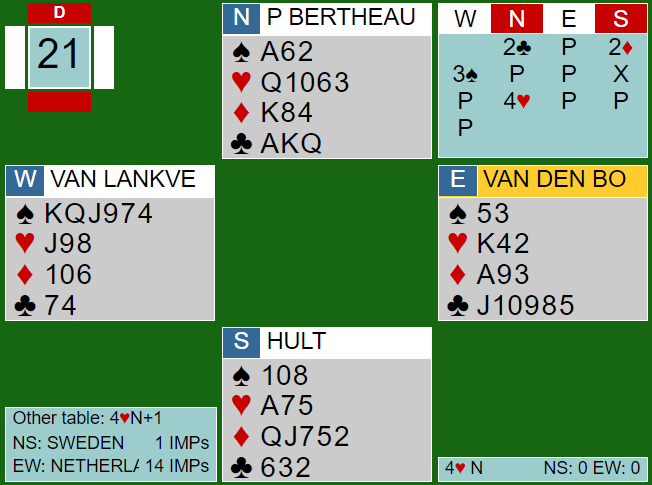 I lagfinalen spilte fire Ø/V-par 6 hjerter, de andre fire var i 7 hjerter.
