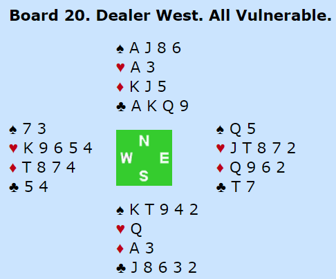 Hvis jeg skal være litt streng her mener jeg at han på øst sin plass som passet på vests hopp til 6 hjerter sovnet av. Med K-Q i trumf og kløver ess burde han lagt på til 7 hjerter. Makkeren meldte tross alt slem med hopp uten to nøkkelkort og trumf dame, så han må nesten ha resten, men tydeligvis er vest bekymret for at det er en kløvertaper. Det var David Ueland (Klepp BK 1) som løftet til 7 hjerter.
