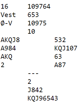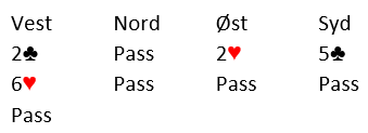 Kanskje, men det blir verre. På samme måte som jeg hevder øst bør legge på til 7 hjerter idet syd sier 5 kløver og vest hopper til 6 hjerter, har øst bra argumenter for å legge på om syd sier 6 kløver og vest 6 hjerter uten å hoppe dit. Men det er klart at siden vest i det tilfellet ikke hopper til 6 hjerter blir det litt mer usikker, for vest er jo en vanvittig presset situasjon pga. 6 kløver-meldingen.