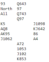 Kjenner ikke system i bruk, men er det Acol kan åpningen være 12-14 (vridde grander) og kanskje svaret fra Nord er game forcing Stayman med eventuelt Puppet svar. Hanlon ville vise ønske om kløver- angrep. Kanskje er fienden på slemjakt, men her ble det «å høre sin egen stemme» da Syd kunne redoble og vise styrke i kløver. Dette må føre til kalassifre kunne tilskuerne konstatere.