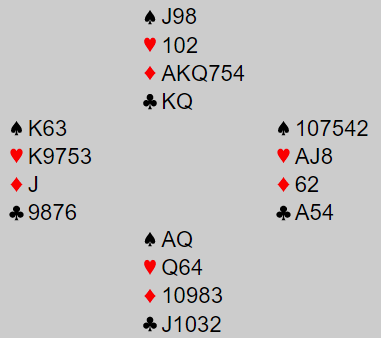 Det gikk tre ganger pass før Gorm Norstad i Øst åpnet med 1 kløver, 2+, og Syd gjentok sin pass før Arild Lysaker (V) svarte 1 ruter og Nord passet. Hva synes du øst nå bør melde, 16 hp er ganske mye og normalt har makker en del verdier siden motparten ikke blander seg inn i major på 1- trinnet. Men hva er mulige gjenmeldinger her? Med bare singel liten spar er grandbud nokså sjansebetonet, støtten im ruter er god og med den fargen som trumf er hånden verd 18 poeng inkludert fordeling for kortfarge. Da vilm kanskje hopp til 3 ruter som invitt være noe for beskjedent?