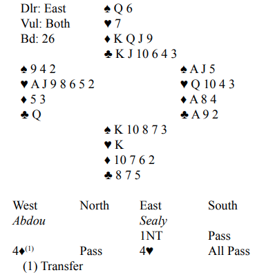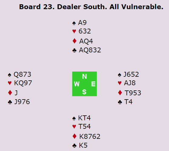Dette er en helt vanlig 3NT selv uten hjerterstopper, for med 3-3 i hjerter hos N/S avhenger 3NT normalt kun av at hjerteren ikke sitter 5-2 hos motparten. Den satt 4-3, men som du ser satt både ruter og kløver uheldig, og det er bare åtte stikk med kun tre i de to fargene.