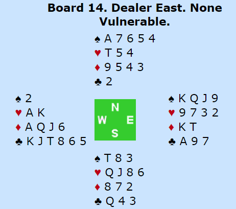 Utspillet var spar 6 som gikk til liten, nieren og damen. Så ruter ess, hjerter til bordet og ruter K-Q for å se om knekten faller. Det gjorde den ikke, og spillefører hadde kun 1+6+3+1 = 11 sikre stikk. Vi som ser alle kortene vet jo at det fra start gikk an å ta tre kløverstikk i dette spillet, kongen sitter jo behagelig i saksen. Men det vet ikke spillefører, spesielt ikke siden syd hadde meldt.