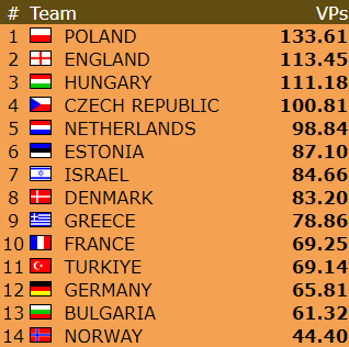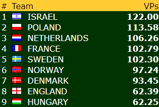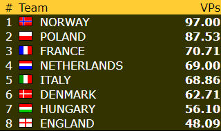 I dag ble alle tre kampene vunnet for U-26 laget. De klatrer på tabellen, og etter åtte kamper spilt og ni kamper som fortsatt skal spilles er det ikke en uoverkommelig margin - vel 20 VP - opp til topp-8 som gir plass i VM. Det får være hovedmålet nå, i første omgang, men kommer laget inn i flytsonen tror jeg de kan score veldig bra de neste dagene.