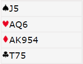 Den norske syd så makkeren åpne med 1 kløver før øst spratt innpå med 4 spar. Syd føler seg litt robbet, for med denne fine fordelingshånden er det mulig det er N/S som har kortene. Men det er kun 6 HP. Kan eller bør han melde noe nå?
