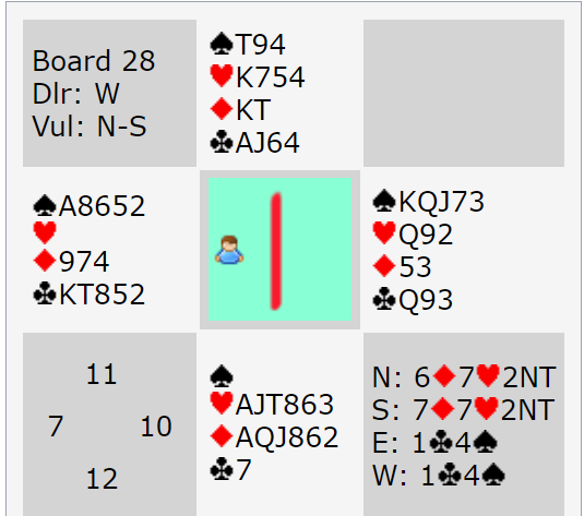 Maks bridge av alle er at N/S melder 7 hjerter og Ø/V stamper i 7 spar som kun koster 500. Så +500 til N/S er "par" på spillet som det heter (det maksimalt oppnåelige i teorien).
