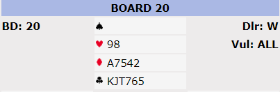 Nord og Syd passer mens Øst åpner i 2 kløver i 3. hånd. Vest har fin fordeling med 6 hp og hvis man ikke bruker avventende 2 ruter- svar er det ikke unaturlig å strekke seg til positive 2 hjerter selv om 6 hp kanskje er vel hardt. Over 2 hjerter kan Øst da svare 2 NT med sine 21 hp og semijevn hånd. Da blir det for hardt for Vest å vise sin andre langfarge og løft til 3 NT dermed mest sannsynlig bud. Av 16 bord kom 8 i 3 NT, alle av Øst. Det skal med aktuell sits ende opp med 11 stikk siden Syd får for hj A ‘og K. Ved de andre bordene ble kontrakten spilt i ruter, men3+3 på Vest sin hånd. Der kan man dedusere at Vest har svart 2 ruter på makkers kravåpning. Men av de 18 bordene i ruterkontrakt kom 9 i vanlig utgang mens de 9 siste spilte 6 ruter. Der har nok Øst i 2. runde vist sin lengste farge, 3 ruter, og Vest enten meldt 3 hjerter (5+ og 4+ hp hvis naturlig) eller støttet direkte med 4 ruter. Bruker man dobbelt avslag kan 3 hjerter (mulig 0-3 hp) bli besvart med 3 NT av Øst der Vest så naturlig kan invitere til utgang+ med 4 ruter. Da går Øst på med 4/5 ess Blackwood og lilleslem som er flott kontrakt kan nås. Alle lokale lag i A- puljen nådde den utapelige slemen.