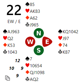 Bakke sitt hopp til 4 spar gjorde det nok vanskeligere for N/S enn østs 2NT ved det andre bordet. Ikke urimelig meldte Plejdrup 5 ruter. I ruterkontrakt var det imidlertid ikke noen avkast å hente, så der ble det kun ti stikk. Spillefører fikk en spar- og en hjertertaper, og om forsvaret ikke gjør feil blir det også en kløvertaper. SCORWAY +50 og 11 IMP.