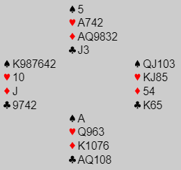 Nord åpner med 1 kløver og syd sier 1 hjerter, naturlig. Nord høyner til 2 hjerter før syd går i 4 hjerter. Utspill?