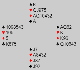 For Hauge åpnet øst med 1 kløver. Mange leker litt med tanken med å klinke til med en sterk grand med dette, men det er ikke helt de riktige kortene for det. Det er ikke slik at å åpne med oppjustert 1 NT (14 poeng) med litt ujevn fordeling (typisk singel honnør) gir noe sånn helt av seg selv bare fordi man er "tøff i trynet"!