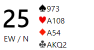 Du sitter nord med dette og får etter å ha åpnet med 1NT vite at makker har femkorts spar og en invitthånd. Du har helt maks for åpningen, og det betyr vi skal i utgang. Det er imidlertid umulig å vite med sikkerhet hva som er beste utgang nå, men for meg skriker det litt grandkontrakt mot meg med 3334 fordeling og alle honnørpoengene utenom sparfargen. Og sparstøtten er heller ikke noe å skryte av. Det er dog litt tynt i de røde fargene. Så det kan godt være bedre i 4 spar, men det kan også godt være fire tapere der, men samtidig gode muligheter for å skrape sammen til ni stikk i grand.