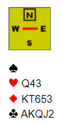 Makker åpner med 1 hjerter (femkorts farge), og øst hopper innpå med 2NT. Og dene meldingen var ikke det vanlige, "begge minor", men en uvanlig konvensjon; 2NT viste 8-9 stikk med en lang farge i kløver, ruter eller spar. De finner jaggu på det...