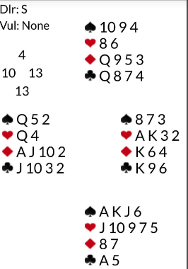 Meldingene gikk 1 hjerter (syd) og svaret 1NT fra nord (som selvsagt kan diskuteres), så pass rundt. Sam Lev ble spillefører.