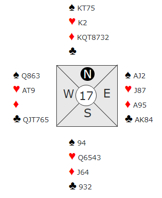 Som du ser er dette spillet slik, trumf konge og ett ess mangler. Så det er en ganske bra slem denne gangen siden sparfargen er så tett, normalt en ren 50% slem avhengig av spar konges plassering (minus kanskje at kløver kan sitte 6-0, eller ruter 6-1 slik at N/S kan få en stjeling).