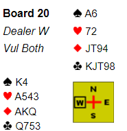 Flott hånd hos Per, og sp A kunne Knut stjele.På hjerter til damen fulgte alle, Ru K kunne tas, spar til ny røff og på ru A fikk Molander sak av sin siste spar. Deretter kom ny trumf til kongen og så hj A siden Ves viste seg å ha tre trumf. Atl var nå over, kløverfinessen kunne ha sokret 13 stikk, men da kl 0 ble sendt av gådge var Vest renons så Øst måtte få stikk for kl K. Men 6 hjerter ble altså vunnet og siden de andre bordene høyst hadde meldt 5 hjerter fil Fredrikstad 1 toppog laget vant 13 imppå spillet.