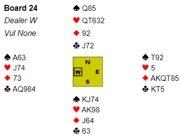 Vinnerlaget bommet i dette spillet. Vest åpnet med 1NT, "minigrand" som viste 10-12, og øst sa 3NT. Nord spilte ut hjerter, og forsvaret tok fem stikk med det samme. Laget som tapte finalen avsluttet godt da Ø/V med et underlig, kunstig meldesystem fant frem til 6 kløver og noterte +920 - 14 IMP.