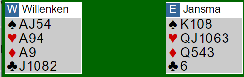 Det er et nesten sikkert innspill her. Du vinner kløverutspillet med esset og stjeler en kløver. Så spar dame. Vest følger med liten. Om du nå tar finessen og den ryker har du kun en 50-50 sjanse igjen, hjerter knekt må lokaliseres. Hvis du derimot spiller spar ess og øst følger farge med liten spar er kontrakten sikker (og faller kongen handler det om overstikk). Hvis begge følger med liten spar har enten vest eller øst ett sparstikk, men de har kun den ene sparen (kongen). Etter spar ess spilles tre runder ruter. Så frir du deg med trumf, og samme hvem som kommer inn er det safe da dette er igjen:
