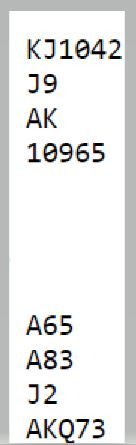 Uten noen indikasjoner er esset fulgt av finesse korrekt spill med en slik farge. Det tar med seg damen fjerde hos vest i tillegg til 3-2 sits. Men spilles slik etter hjerterutspill mot slem blir det bet: