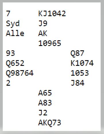 Vinnerlaget spilte 6 spar med syd som spillefører, og da kom naturlig nok singel kløver i utspill. Tolv enkle stikk, +1430. Ved det andre bordet ble heller ikke det truende hjerterutspillet funnet - uavgjort spill.