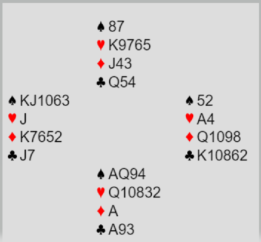 Vest var giver og ingen i sonen. Det gikk tre passer før Kristoffersen (syd) åpnet med 1 hjerter. Vest meldte inn 1 spar, nord viste hjerterstøtte og kontrakten ble til slutt 4 hjerter som også ble spilt ved det andre bordet. Ved begge bord kom ruter 2 (norske) i utspill til liten åtteren og esset. Kristoffersen spilte trumf til damen og esset. Øst skiftet til spar til syds ess. En trumf ble spilt til bordet, ruter til stjeling og spar fra syd som vest vant med tieren. Vest fridde seg med liten ruter til knekten, damen og stjeling. Så ble en spar stjålet og dette var igjen: