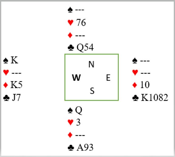 Han antok vest hadde 5-5 i spar, sparsitsen var klar og det så ut som vest hadde ruter konge. Er dette riktig kan ikke vest ha kløver konge for med det kortet i tillegg og en 5-5 hånd ville mest sannsynlig vest ha åpnet. Med kløver konge hos øst blir det fort to kløvertapere og en bet, men det var en liten mulighet pga. av syds kløver 9! Hvis vest hadde knekten eller dobbel i kløver kunne det ordne seg, og han spilte på det med et uvanlig trekk med slik kløver, damen fra bordet! Nå får ikke Ø/V tak i to kløverstikk. Det går kløver dame, konge og ess. Hvis vest beholder knekten er han snart moden for et innspill. Spar dame trumfes, så kløver som vest må vinne med knekten før han må spille til dobbeltrenons som gir stjeling med kløveravkast fra den andre siden.