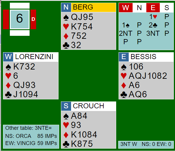 I stedet for å godspille hjerteren som ikke kan gå bra (om ikke nord har hjerter konge dobbel) ble det tatt kløverfinesse. Nå kunne syd spille ruter til det single esset. Spillefører tok kløverstikkene og forsøkte så ruter dame fra hånden til syds konge. Det var det fjerde stikket til forsvaret. Crouch spilte i firekorts posisjonen, da det var kun hjerter igjen hos øst hjerter 9 rett opp i saksen. Berg hadde beholdt tre hjertere og la selvsagt liten slik at han kunne ta de to siste stikkene med hjerter konge og ett sparstikk - to bet, +200.
