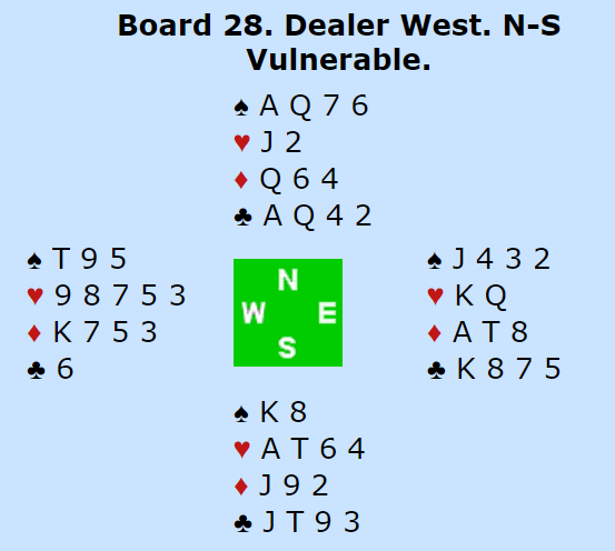 Syd hadde sp 43- hj 10- ru K109864- kl AD62 og kontrakten ble dermed vunnet. I det andre rommet valgte Jan Mikkelsen mot samme kontrakt å spille ut ruter og dermed hadde Øst lett spill for 12 stikk.