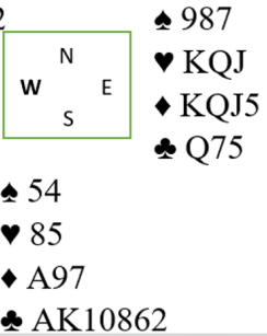 Siden du vet at begge kløverhonnørene vil gi stikk vinner du med kongen og spiller kløver ess selv om vest prøver seg med en falsecarding idet han legger knekten i første stikk. Du lar deg ikke lure, den knekten kan ikke være en singelton, for da har makker spilt ut nieren fra trekorts farge. I andre stikk følger både vest og nord så du vet hvordan den fargen sitter.