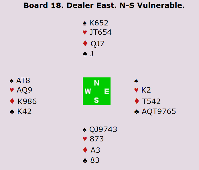 Åpningen var antar jeg en tofargehånd med begrenset styrke, 2 NT ber åpner å vise ny farge og hoppet viser nok 5-6+ i meldte. Trolig var resten kontrollvisende med 5 spar som renons. Da kunne Damian telle opp 13 stikk bare sparfargen på 6-0 fordeling kunne godspilles.
