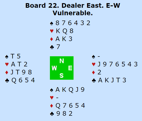 Som sagt, ingen garantier, men det er meget sannsynlig at øst har fire spar, fem hjerter (det vet vi) - 3 ruter (som vi også vet) og en kløver, dvs. 4-5-3-1 fordeling, altså singelton kløver!