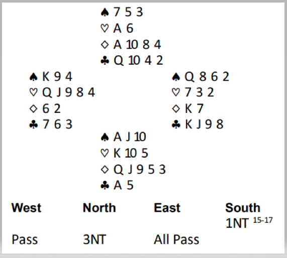 Da spillet forekom tenkte spillefører omtrent sånn og la ned kløver konge som begge fulgte med småkort på, så kløverfinesse over vest.