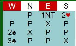 Det strakk til åpning 1 spar og da jeg erfarte at Jan P. kunne melde 2 ruter som Øst så mye lyst ut. Han har minst 10 hp og 4+ kort i ruter. Gode motspillere, Jonny Hansen i Nord og Eskil Hagen i Syd kunne vi ikke la oss bli skremt av., men jeg nøyde meg med gjenmelding 3 ruter og avventet et gunstig svar fra makker. Det kom i form av 3 NT! Det jeg var mest fornøyd med nå var at det må bety hold i hjerter og trolig også i kløver, men der er 3- kort sannsynlig max lengde.