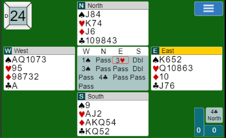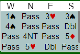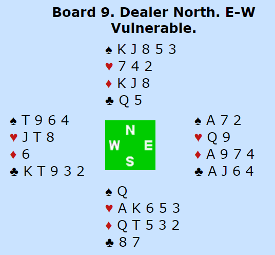 4 ruter var altså ment som cue- bid og han viste med 6 hjerter at han hadde 4-6 i majorfargene. Godt meldt, men med kl J ut fra Øst skulle Gjøs spille hjem 12 stikk, minst. Hva ville du satset på? Utspillet gikk til kl D og Gjøs satset på at 13 stikk kanskje kunne vinnes. Derfor dro han ru A fulgt av ru K men da jeg i Vest på siste la ru D ble han betenkt, men satset likevel på at jeg hadde minst 3-kort ruter. Ru 3 til9 hos Marthinussen, røff i bordet og ru 10 hos meg ga info nok. Inn på hj A og en 4. ruter det Nord var utsolgt godspilte ru 5 i bordetsiden Vest hadde hatt ru DJ103 fra start. På hj K og hj Doppstom ingen vansker og de siste stikkene ble tatt av ru K5 med avkast av sp 9 8. 13 stikk og topp!