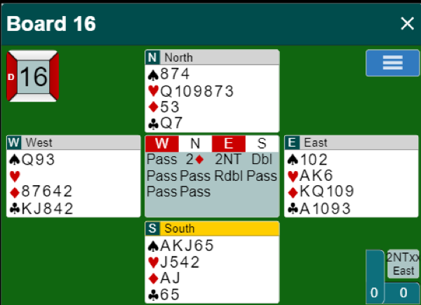 Kongen taper til esset, og NS må også få et stikk til i trumf, og en dobla bet. I resten av salen var scorene ØV, så slukøret måtte den uheldige engerdøl konstatere at eksperttipset fra forrige turnering ikke ledet til suksess.