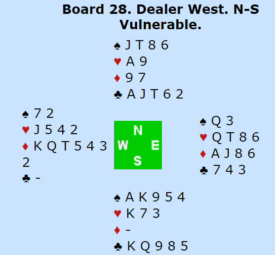 Med litt forsiktig pass i stedet for å melde 3 ruter fra Vest fikk da Kjennbakken vist sin langfarge og da det deretter gikk pass rundt var det etterpå enkelt for Nord å snelle inn 9 stikk som ga dem topp med 110 inn. Ø-V kunne fightet i ruter og den kontrakten ville gitt 10 stikk! Thor påpeker at han selv høyst kan ha dobbelton i spar, for med 3- kort kan han doble for å vise det hvis Torfinn over 2 ruter hadde passet.