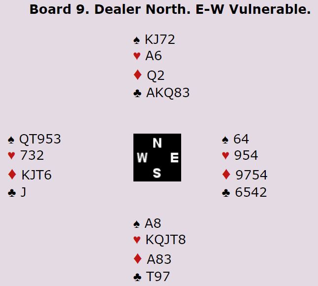 Dette er et læreboksspill. Hvis ruter sitter 4-4 spiller det ikke så mye rolle hva spillefører gjør i ruterfargen, men sitter utspillsfargen 5-3 må spillefører forsøke å kutte forbindelsen mellom øst og vest i fargen. Ruteren må lasjeres to ganger, og håpet er at den som kommer inn (øst i dette tilfellet) har kun tre ruter. Da kan det å bra selv om det må avgis to kløverstikk. Og kløverfargen er fargen spillefører må sette sin lit til.