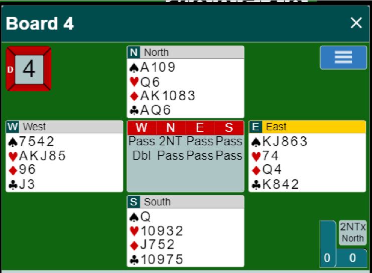 Nord hadde passet først og Syd gjorde det samme, men makker Tone AnnetteOlsen meldte 2 hjerter, overføring til spar , lover 5+ i den fargen men sier ikke noe foreløpig om styrke. Hun hadde: