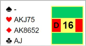 Merk at dette er en sånn spørresituasjon hvor 4NT som spørsmål er litt høyt. Over 5 ruter-svar på 4NT (og hjerter er trumf) blir det ikke plass til å spørre om trumf dame. Så her måtte Sunde gjette. Han valgte altså å si 6 hjerter! Det kan jo være at vest har femkorts trumf også, og da går det som regel bra selv om hun ikke har trumf dame. Men har hun fire små hjerter må det sitte 2-2, og er det kun trekorts trumf hos vest kan det være for hardt med slem.
