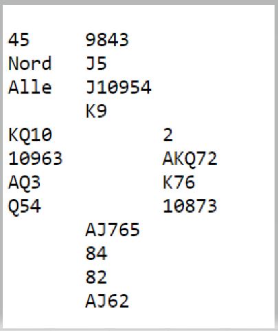 Jeg vet ikke om de som satt Ø/V ved det bordet hadde gode avtaler, men det kan godt være. Vest sa pass, og øst slo av i 5 hjerter. Selv om kanskje svaret viste ett nøkkelkort var ikke øst sikker på om trumfen var helt sikker, og de kan godt sitte skjevt her sånn som syd driver og melder.