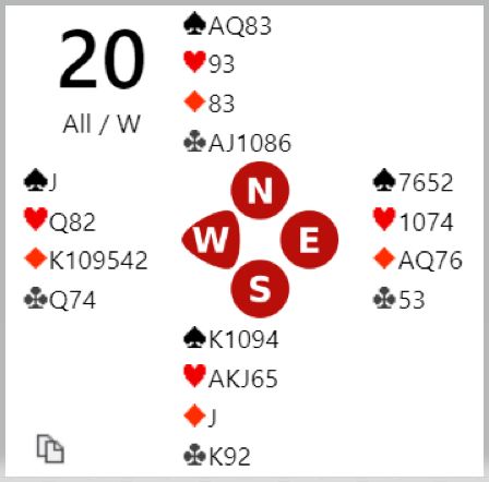 Kun ved ett annet bord ble det score på Ø/V sin side. Ved det bordet hadde åpenbart N/S en meldemisforståelse da de spilte 2NT! Ø/V tok seks ruterstikk, en bet i delkontrakt der de har en mulig slem i kortene!
