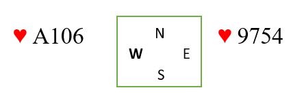 Det kommer en liten hjerter ut fra nord mot din grandkontrakt. Det er jo svært ofte sånn at du må innom motparten for å godspille egne stikk du kan ta for idet du kommer inn igjen. Hvis hjerteren i dette tilfellet sitter 4-4 spiller det ingen rolle hva du gjør i starten, de vil få tre hjerterstikk i det de kommer inn igjen, og de får totalt tre hjerterstikk om du lasjerer også. Men om hjerteren sitter 5-3 kan det være du tjener på å lasjere (ligge unna) to ganger, og så stikke tredje gang. Stikkes med esset første eller andre gang kan han med trekorts hjerter spille inn makkeren i fargen hvis det er han med trekorts hjerter som kommer inn idet du må slippe dem inn. Hvis du lasjerer to ganger, og han med trekorts hjerter kommer inn (for eksempel på ett ess) er det ikke sikkert den motspilleren med femkorts hjerter har noe inntak, og han/hun blir sittende å se på hjerterstikkene sine resten av spillet!