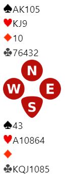 Ps. Det var endel andre som spilte 7 hjerter doblet med enten -100 eller -300. Noen fikk spille 6 hjerter doblet med en bet, og ved tre bord ble 6 hjerter doblet vunnet, N/S +1210! Toppen til Ø/V kom der Ø/V fikk spile 7 kløver doblet og noterte +2330. Ett par til fikk være i fred i 7 kløver (+2140). Med andre ord ble det i dette spillet en sving på hele 3540 poeng mellom beste N/S score og beste Ø/V score.