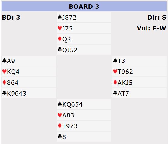 Etter pass fra syd åpnet vest med 1 kløver (2+ kløver, vanlig åpning). Nord sa pass, øst viste hjerteren og syd meldte inn 1 spar. Vest doblet for å vise trekorts hjerter. og nord støttet sparen på to-trinnet. Ofte vil vi slik vi spiller melde på tre-trinnet direkte med firekorts trumfstøtte til en majorfarge, enten med 3 spar (sperrende), eller en melding som viser "mixed raise", dvs. firekorts trumfstøtte og typisk 7-9 poeng (vi bruker fargen under 3M som "mixed"). Men her har syd passet først, så nords støttemelding på to-trinnet kan nok godt innebære firekorts støtte, men det er ofte kun trekorts støtte. Øst sa 3 spar, spørsmål om hold, og vest meldte 3NT.