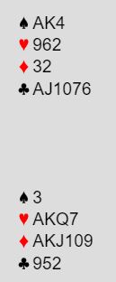 Der Namsos satt N/S gikk det 1R-2K, 2H før nord meldte 3NT. Det ser logisk ut, minimum for 2-over-1 utgangskrav og "alt" i de sorte fargene, mens makkeren har gode kort i rødfargene. Men nord har gode kort med toppkontroller, så det var kanskje likevel litt forhastet å hoppe til 3NT (hvis jeg forutsetter at 2K var utgangskrav)? Og kanskje kunne syd meldt en gang til (4K)? Vel, de spilte 3NT, og 6 kløver er en bra kontrakt. At en av to kløverhonnører sitter foran skjer i 75% av tilfellene, men det må litt mer til hvis kløveren sitter 4-1. Likevel er det en bra lilleslem med kløver som trumf.