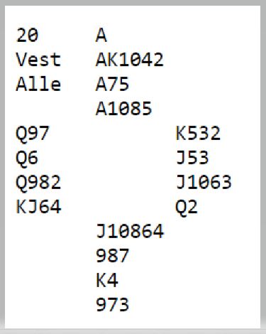 Noen la simpelthen ned ess-konge i trumf, stjal så en ruter og spilte kløver ess og mer kløver. Da ble det bet i 4 hjerter siden hele spillet så slik ut: