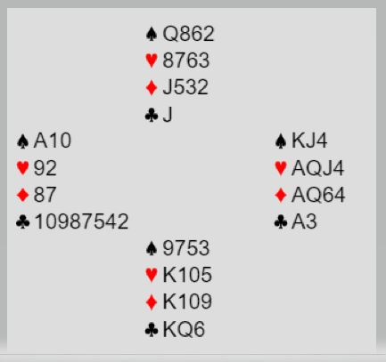 Spillet er fra Realbridge Online Lag hvor de har kommet frem til sluttspillskamper. Dette er fra en kamp mellom Nordnorsk mix og Mixmax, to sterke lag. Ved begge bord gikk meldingene 2NT (20-21) i åpning fra øst, og vest løftet til 3NT. Utspill?