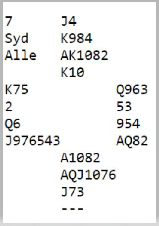 I 6 hjerter går det ikke an å unngå spartaper så ruteren må gå for at det skal kunne bli tolv stikk. Med åtte rutere til sammen er beste sjanse å ta finessen. Damen foran er 50%, men en liten tilleggsjanse er at damen sitter singel bak, for før finessen tas bør en topphonnør innkasseres. Å spille på damen dobbel bak er klart mindre sjanse enn damen tredje, fjerde eller femte foran. I tillegg til rutersjansen kan jo det hende vest noen ganger spiller ut kløver ess mot slem, og med kongen godspilt er det ingen problemer, kun en spartaper og mulighet for tretten stikk. Men meldingene kan kanskje ha avslørt at kløver ess ut er fånyttes, for noen steder vil syd ha fortalt om renons i kløver.