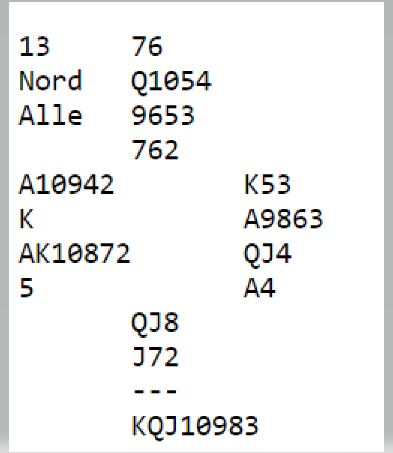 For vårt U-21 lag startet kampen mot England (runde 5) verst mulig da England tidlig fikk hjem en doblet delkontrakt samtidig som de vant utgang andre veien ved det andre bordet, 15 IMP ut for Norge, Etter 12 av 18 spill ledet England med 39-14. Men så kom Norge sterkt, og ett av spillene i snuoperasjonen mot slutten av kampen var dette hvor Ø/V hadde bra kort:
